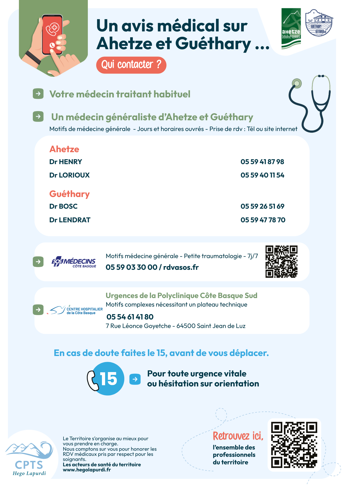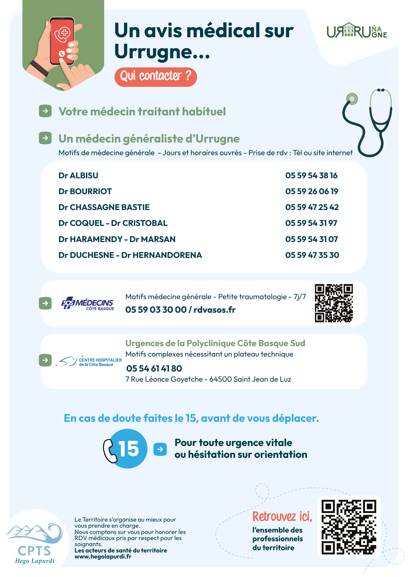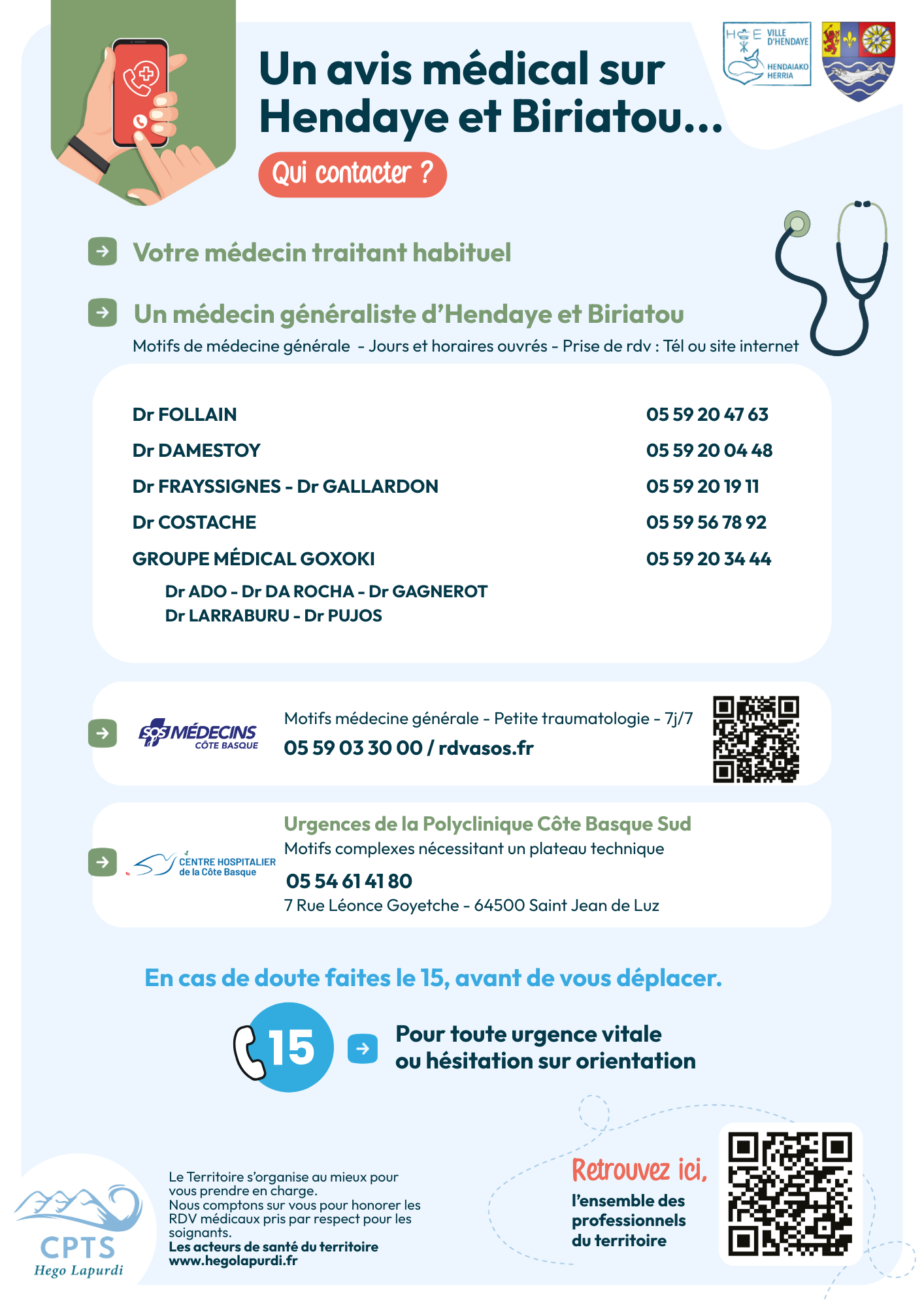 • Diffusion d’une affiche « Où trouver un avis médical » dans les lieux stratégiques (pharmacies, offices de tourisme, hébergements touristiques, etc.) afin d’orienter les patients.